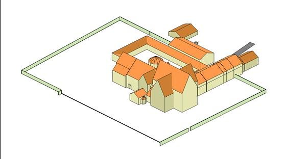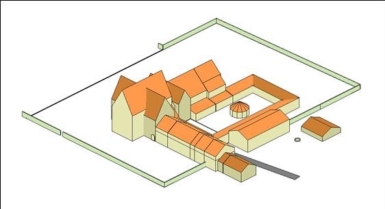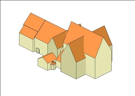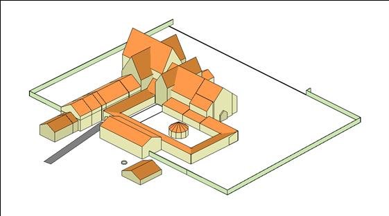 Kyrka och kloster sedda snett uppifrån från NO.